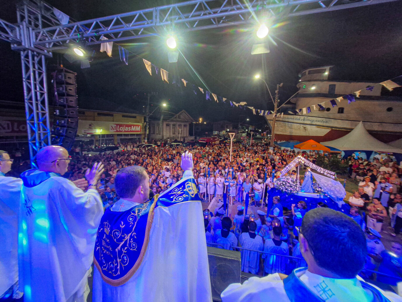 A noite de segunda-feira (02) foi marcada pela fé e devoção de centenas de fiéis de Navegantes e turistas que participaram da Santa Missa e, na sequência, da tradicional procissão terrestre, com o maior manto do mundo. As celebrações integram a 130ª Festa de Nossa Senhora dos Navegantes, que acontece de 30 de janeiro a 08 de fevereiro, extensa programação religiosa, cultural e gastronômica.